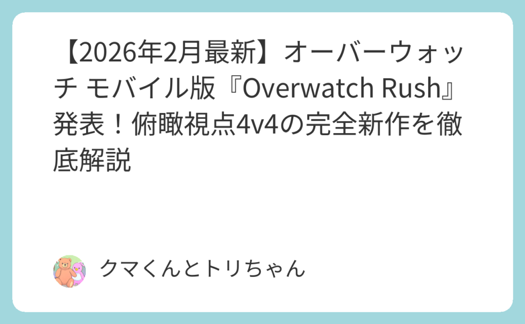 「オーバーウォッチがスマホで遊べるようになるって本当?」——2026年2月24日、Blizzard Entertainmentがついにその答えを公式に発表しました。 モバイル向け完全新作『Overwatch Rush』(原題)が正式発表されたのです。「移植版では断じてない」とBlizzar... -