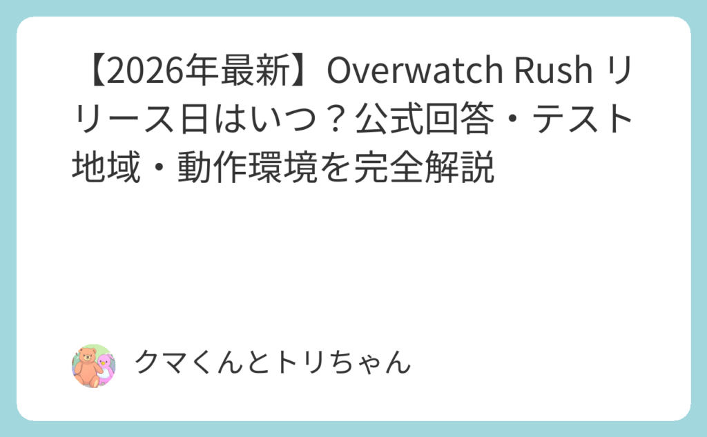 「Overwatch Rushっていつ出るの?今すぐ遊びたい!」——2026年2月24日の電撃発表から、世界中のプレイヤーが抱く最大の疑問がこれです。 残念ながら、Blizzardの公式回答は正直すぎるほど率直なものでした。「It's far too early to say(まだ全く言える段... -
