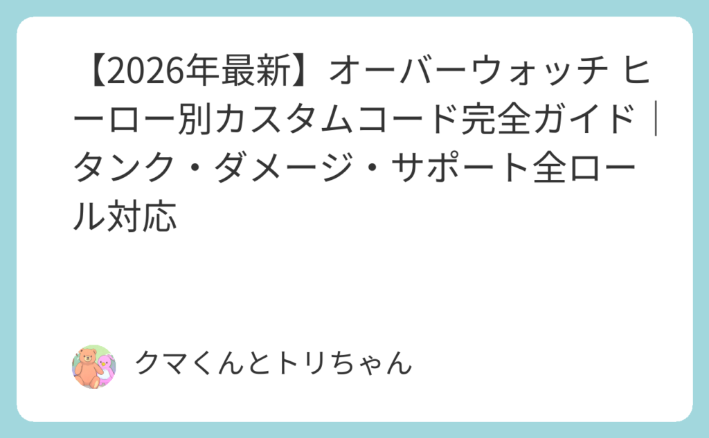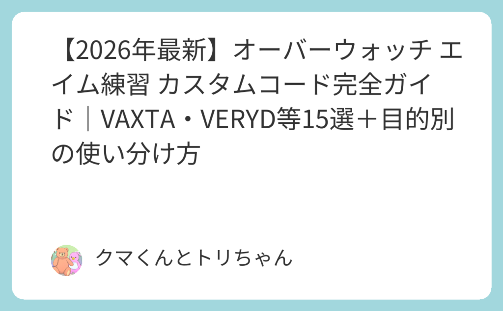 「好きなヒーローを使いこなしたいのに、練習しようにも何から始めればいいかわからない……」——汎用エイム練習コードを使い続けても、「そのヒーロー特有のスキル使いこなし」や「ウルト精度」はなかなか上がらないのが現実です。 実は、オーバーウォッチの... -