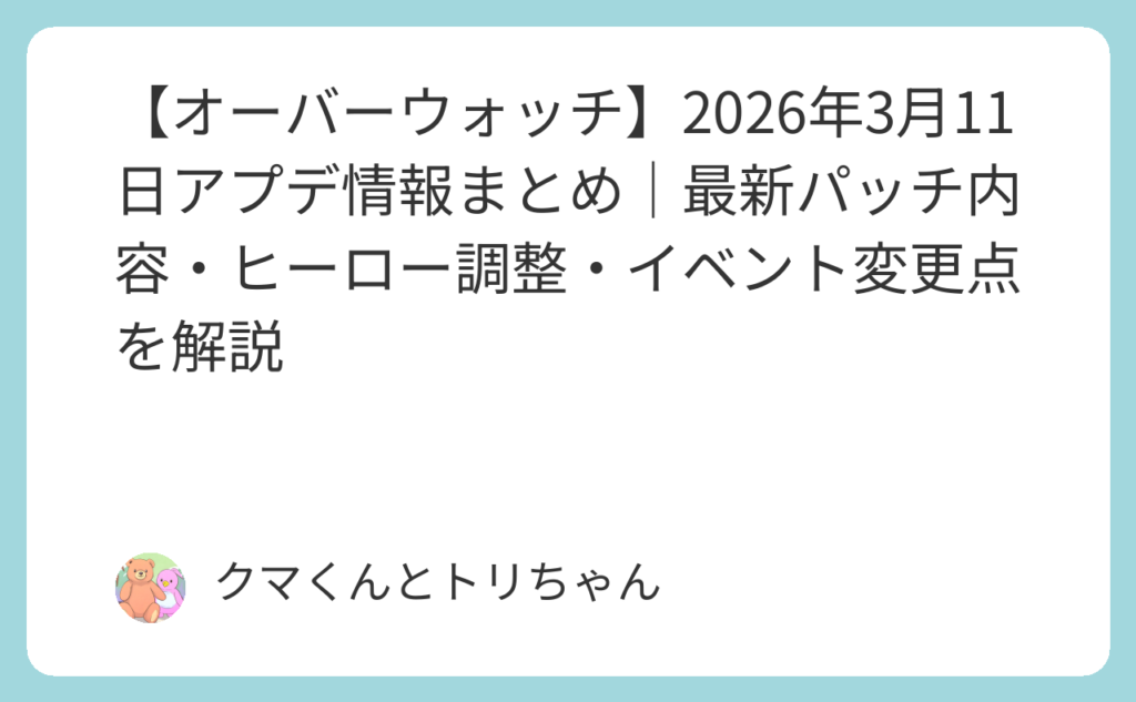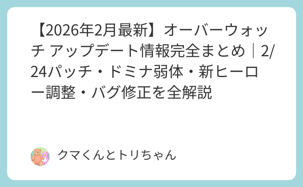 「最近のパッチで何が変わったの?使ってるヒーローが弱体化されてない?」——シーズン開幕直後からBlizzardは複数回のパッチを矢継ぎ早に配信しており、最新状況を把握できていないプレイヤーが続出しています。 2026年2月だけで「2/10(シーズン開幕)→2/... -