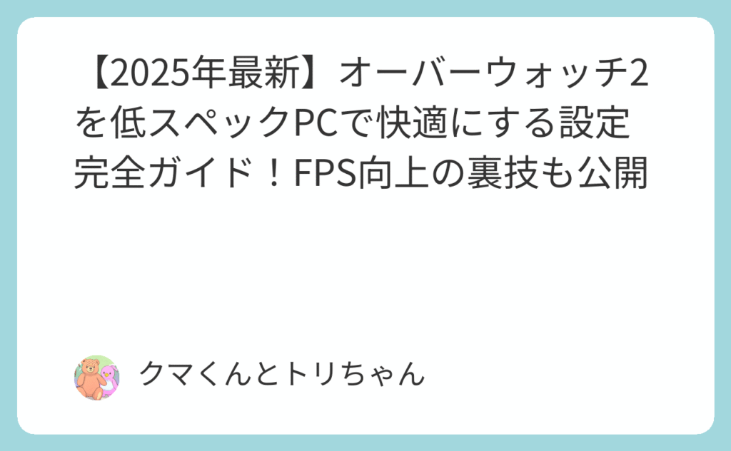 その「カクつき」があなたの勝利を奪っています。低スペックPCでも勝てる設定の「真実」 「オーバーウォッチ2をプレイしたいけど、PCのスペックが心配…」 「ゲーム中にカクついて、エイムが定まらない。これじゃ勝てない!」 「設定を下げても重い。もうこ... -
