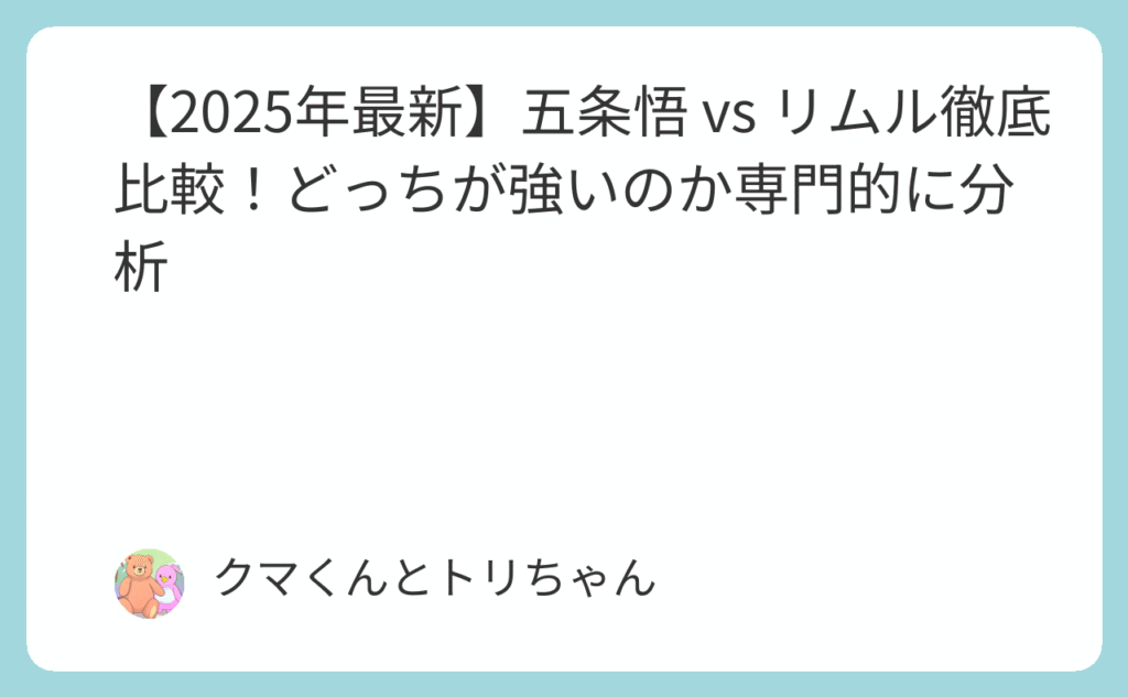 その「最強論争」、ついに決着の時が来た 「五条悟とリムルが戦ったらどっちが勝つの?」 「無下限呪術とアザトースって、どっちの方が強い能力?」 「ファンの間でずっと議論されてるけど、結局答えは何?」 もし、あなたがアニメ界の2大最強キャラクター... -