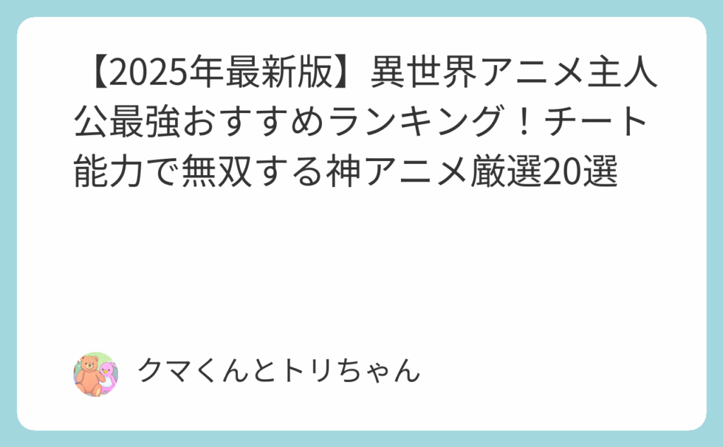 その「俺TUEEE」、あなたは本当に最高の作品を見逃していませんか? 「異世界アニメで主人公が最強のやつが見たい!」 「チート能力で敵を無双するスカッとする展開はない?」 「2025年の最新作から定番まで、本当に面白い作品だけ教えて!」 もし、あなた... -