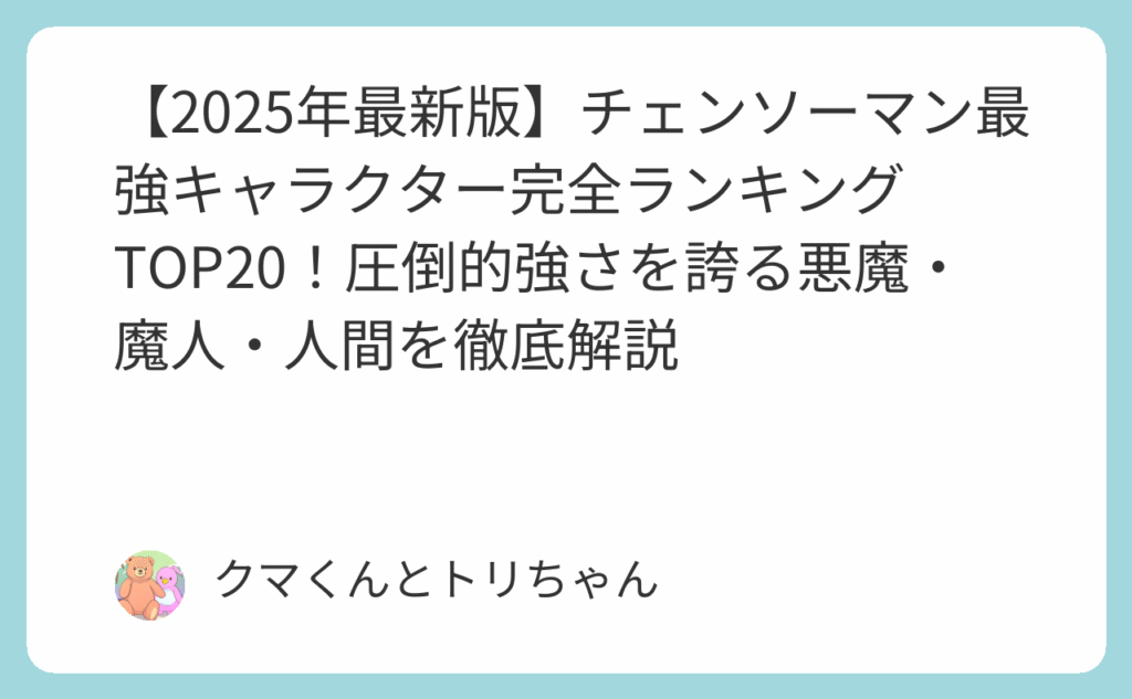 チェンソーマンの世界には数多くの強力なキャラクターが登場しますが、その中でも真の最強は一体誰なのでしょうか。本記事では、戦闘力・恐怖度・作中での実績を総合的に評価し、最新情報を基に決定版ランキングを作成しました。 最強ランキングの評価基準... -