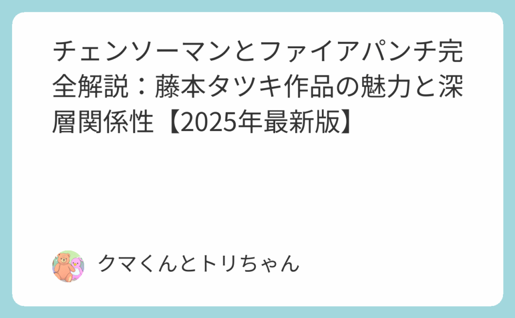 チェンソーマンで世界的な注目を集める藤本タツキの原点となったファイアパンチ。両作品は独立したストーリーでありながら、作家性や表現技法において深い繋がりを持ち、現代漫画界に革命をもたらした記念すべき作品群です。本記事では、両作品の関係性を... -