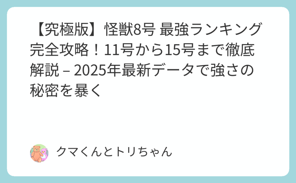 驚愕の戦闘力バトル!怪獣8号最強決定戦開幕 2025年、怪獣8号の世界がますます激化している今、ファンの間で最も熱い議論となっているのが「最強キャラクターは誰なのか?」という永遠のテーマです。 特に怪獣11号から15号までの新世代怪獣たちの登場によ... -
