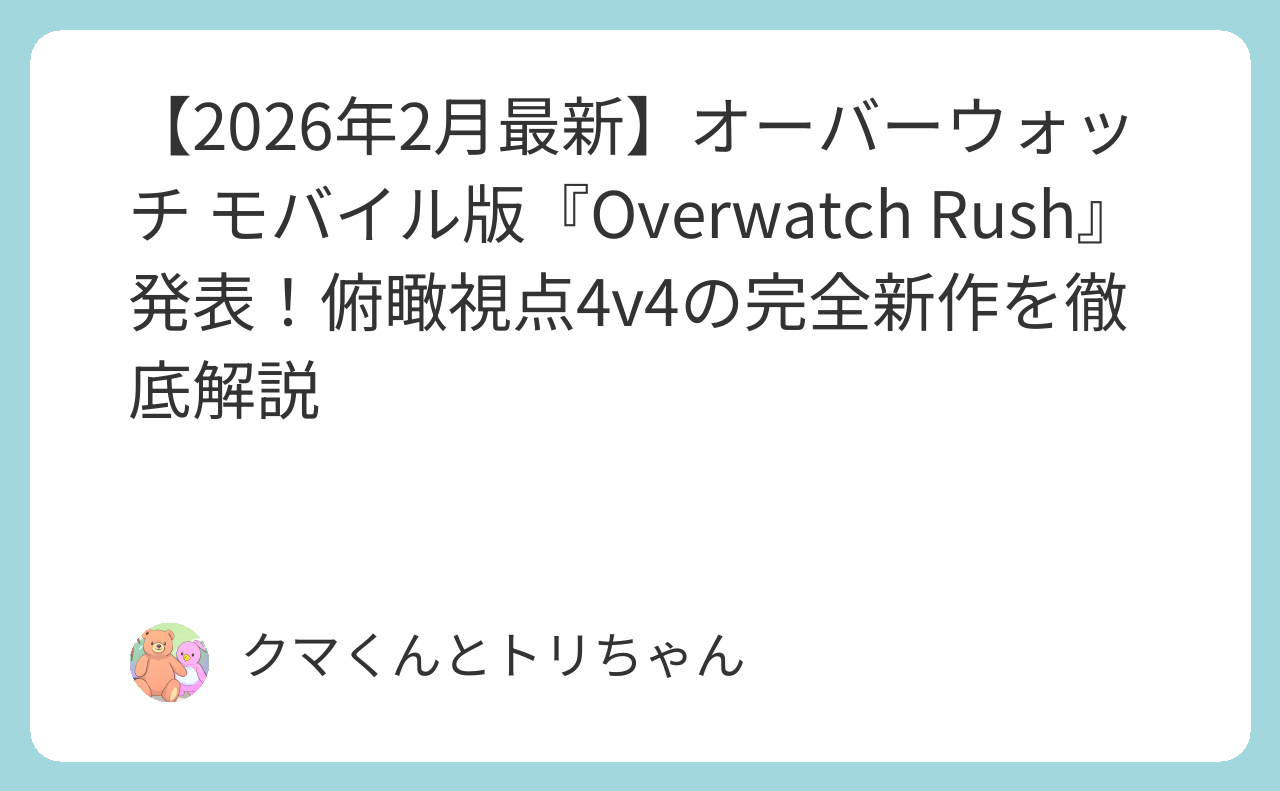 → 海外メディアが一次情報を最速でカバーする傾向。英語が読める場合はこれらのRSSを登録 - X(旧Twitter)で「Overwatch Rush」「OWRush」のキーワード通知設定