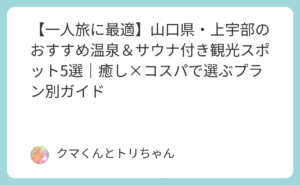 山口県・西沖エリアは、騒がしい観光地とは違い、“癒し”に特化した大人の一人旅にぴったりのスポット。温泉・サウナ・自然・静寂の4拍子が揃ったこの地で、心身ともに整う旅を体験してみてはいかがでしょうか?